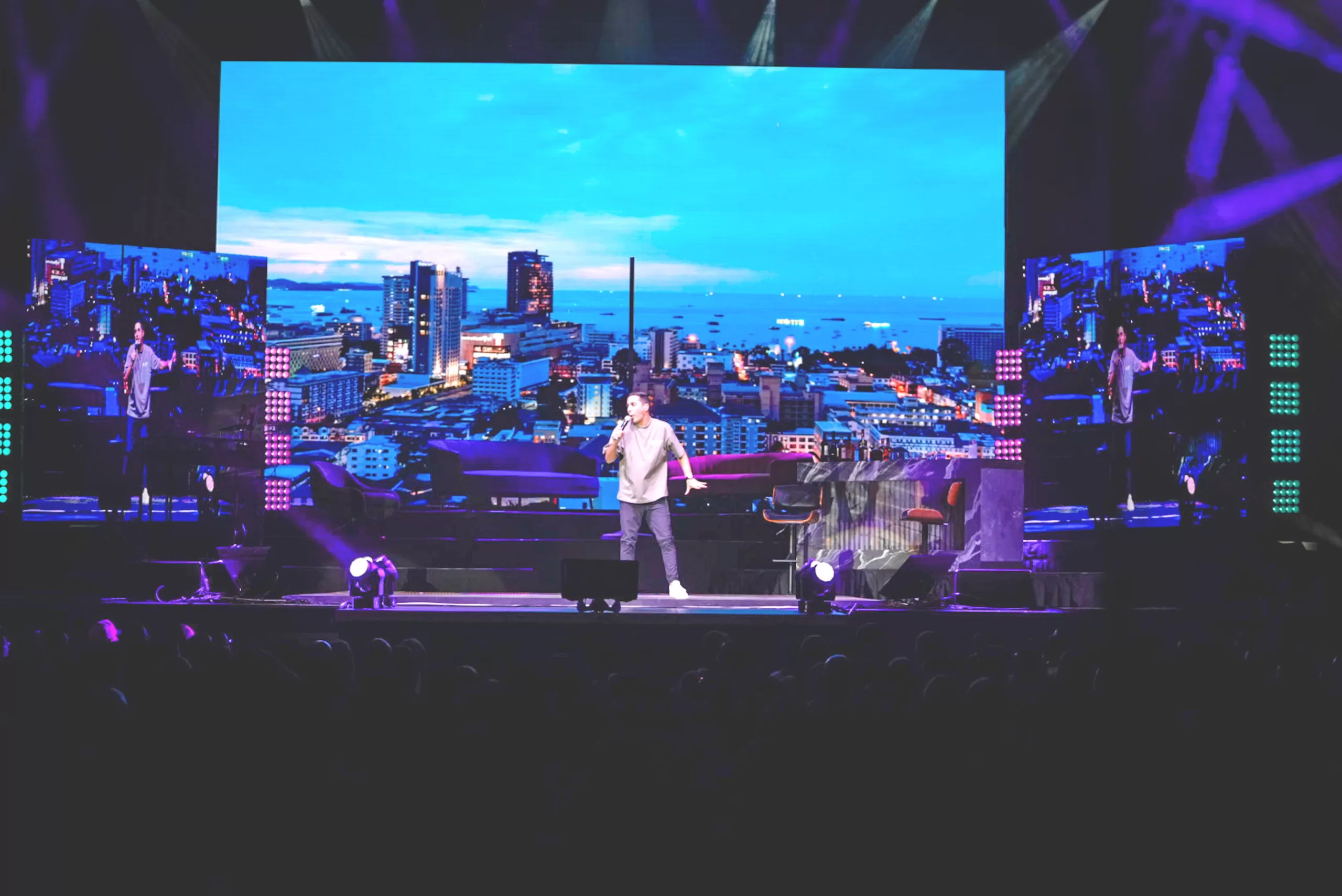 todos antes del inicio del espectáculo. El escenario incluía una sala con asientos, barra y tres pantallas que formaban parte del montaje.